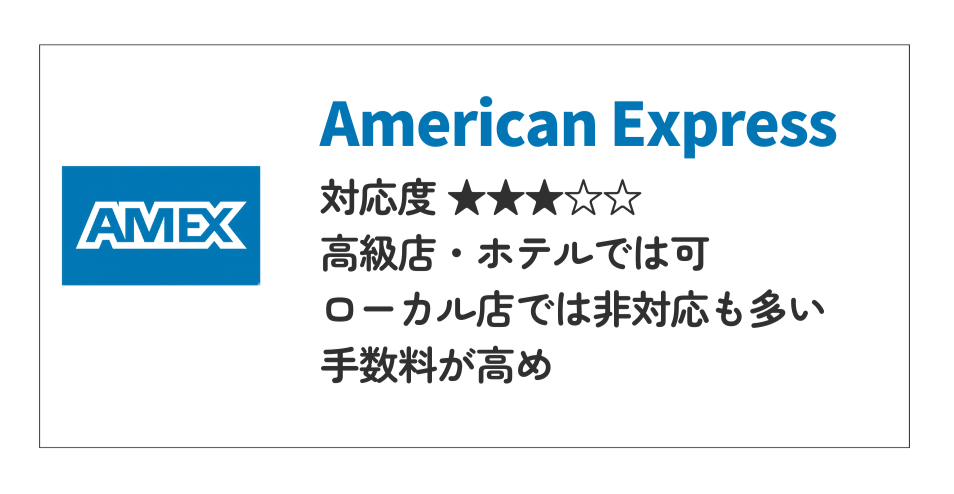 | American Express (Amex) | ★★★☆☆ | 高級店・ホテル、大手スーパーなどでは可。ローカル店や個人商店では非対応の場所も多く、加盟店手数料が高いため敬遠されがちです。 |