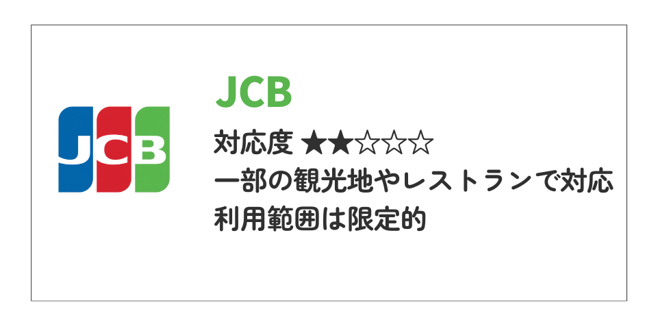 | JCB | ★★☆☆☆ | 一部の観光地や主要なレストラン、大手百貨店などでの対応に留まります。利用範囲は限定的なため、メインカードには不向きです。 |