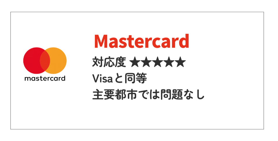 | Mastercard | ★★★★★ | Visaと同等に広く普及しており、メインカードとして最適です。主要都市では問題なく利用できます。 |
