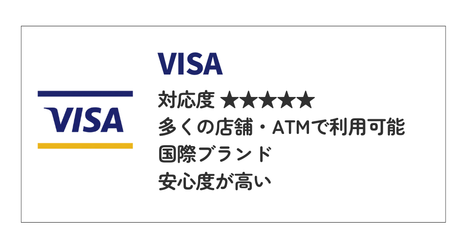 | VISA | ★★★★★ | 多くの店舗・ATMで利用可能。オーストラリアで最も普及しており、メインカードとして最適です。安心度も高いです。 |