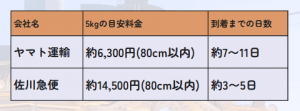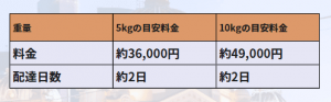 ヤマト運輸の場合、2㎏(60cm以内)で3,700円、5㎏(80cm以内)で6,300円、10㎏(100cm以内)で11,960円。お届け日数は約7~11日です。