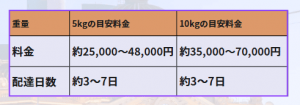 佐川急便の場合、2㎏(60cm以内)で10,738円、5㎏(80cm以内)で14,500円、10㎏(100cm以内)で27,494円。お届け日数は約3日~2週間です。
