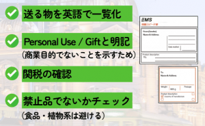 オーストラリアに荷物を送る場合、税関告知書に英語で送付するすべての品物の名前を記載する必要があります。また、商業目的の郵送でないことを示すために、「Personal Use(個人使用」または「Personal Gift(個人的な贈り物)」と記載しましょう。