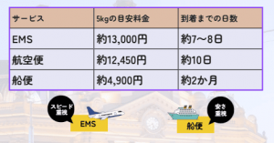 日本郵便から送る場合、EMS(国際スピード郵便)、航空便、船便の3つから選べます。荷物が5㎏の場合、EMS(国際スピード郵便)がお届け日数約7~8日で13,000円、航空便がお届け日数約10日で12,450円、船便がお届け日数約2か月で4,900円です。郵送スピードと料金は比例するので、都合に合うものを選びましょう。