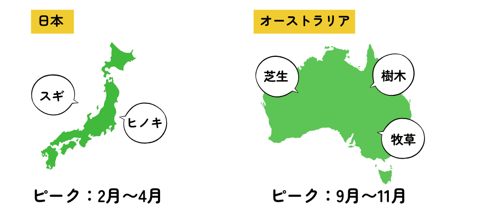 日本はスギやヒノキが主な原因なのに対して、オーストラリアは芝生や牧草などが花粉症の原因となっています。