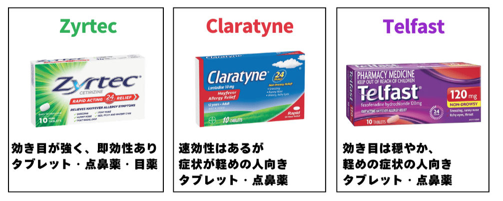 テルファストは、日本で有名なアレグラと同様のフェキソフェナジンを使った薬です。タブレットと点鼻薬があります。速効性はあるが症状が軽めという方向けです。