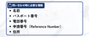 電話が繋がったら名前、パスポート番号、電話番号、申請番号(Reference Number)、住所を伝えます。